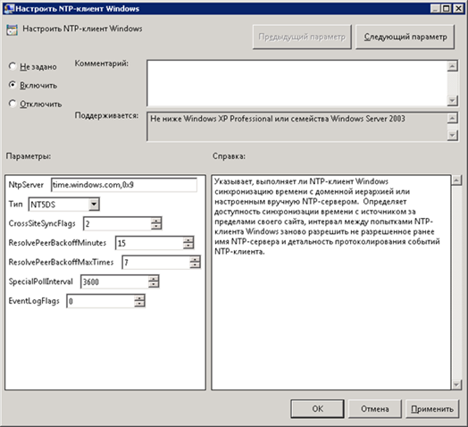 Обратите внимание на секцию [TimeProviders], а именно значение параметра Type должен быть NTP, и в параметре NtpServer должны бать перечислены источники точного времени. Все это можно посмотреть в ветке реестра: HKEY_LOCAL_MACHINE\SYSTEM\CurrentControlSet\services\W32Time\Parameters